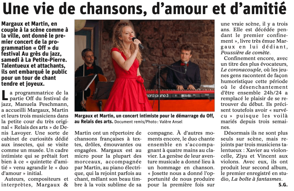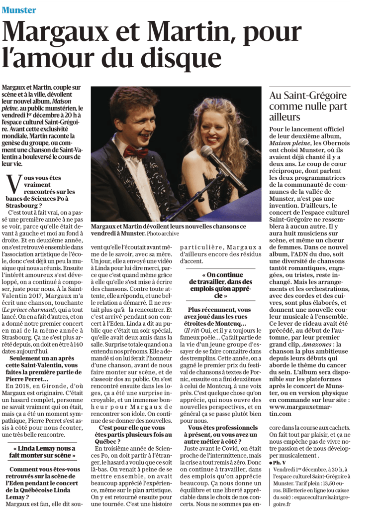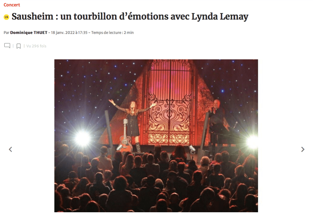 DNA/L’Alsace, janvier 2022 – Où l’on évoque notre passage sur la scène de Lynda Lemay et notre « superbe chanson »