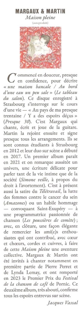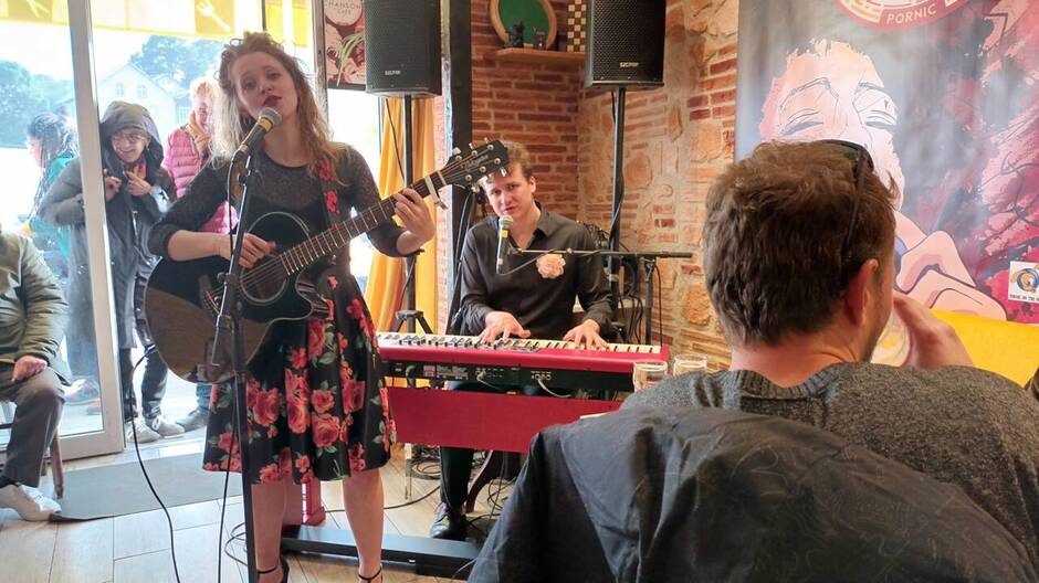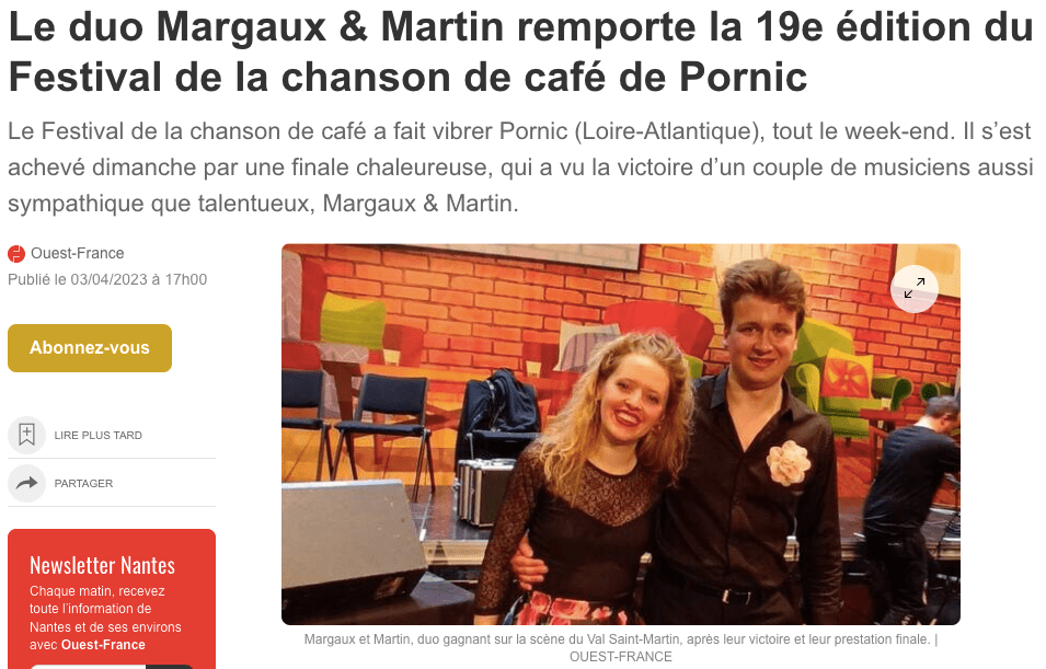 Ouest France, avril 2023 – Notre premier prix du festival de Chansons de café de Pornic relaté par Nathalie Hopkins !